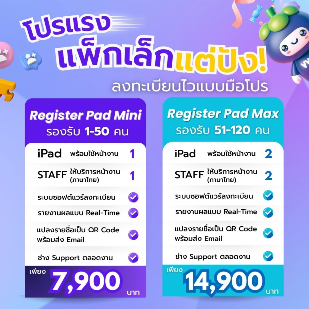 บริการให้เช่า ระบบลงทะเบียนเข้างาน Event ด้วย QR-Code ที่สะดวกรวดเร็ว ตอบโจทย์ ทุกๆการลงทะเบียนเข้างาน ด้วยการนำเทคโนโลยีมาใช้ ซึ่งจะทำให้ท่านหมดปัญหาเรื่องการลงทะเบียนเข้างาน หมดปัญหาเรื่องการทำแบบสอบถามก่อนเข้างาน และหมดปัญหาการต่อคิวเป็นแถวยาว